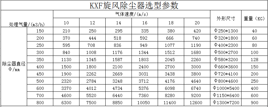 KXF型旋風除塵器選型參數(shù):